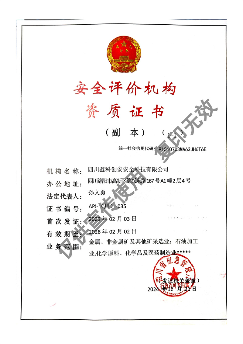 四川鑫科創(chuàng)安安全科技有限公司成立于2020年,是川北地區(qū)取得資質(zhì)的民營(yíng)安全評(píng)價(jià)機(jī)構(gòu)(資質(zhì)證書編號(hào):APJ-(川)-035)。并于2022年?duì)款^成立綜合應(yīng)急救援隊(duì)伍 - 綿陽(yáng)曙光應(yīng)急救援中心。